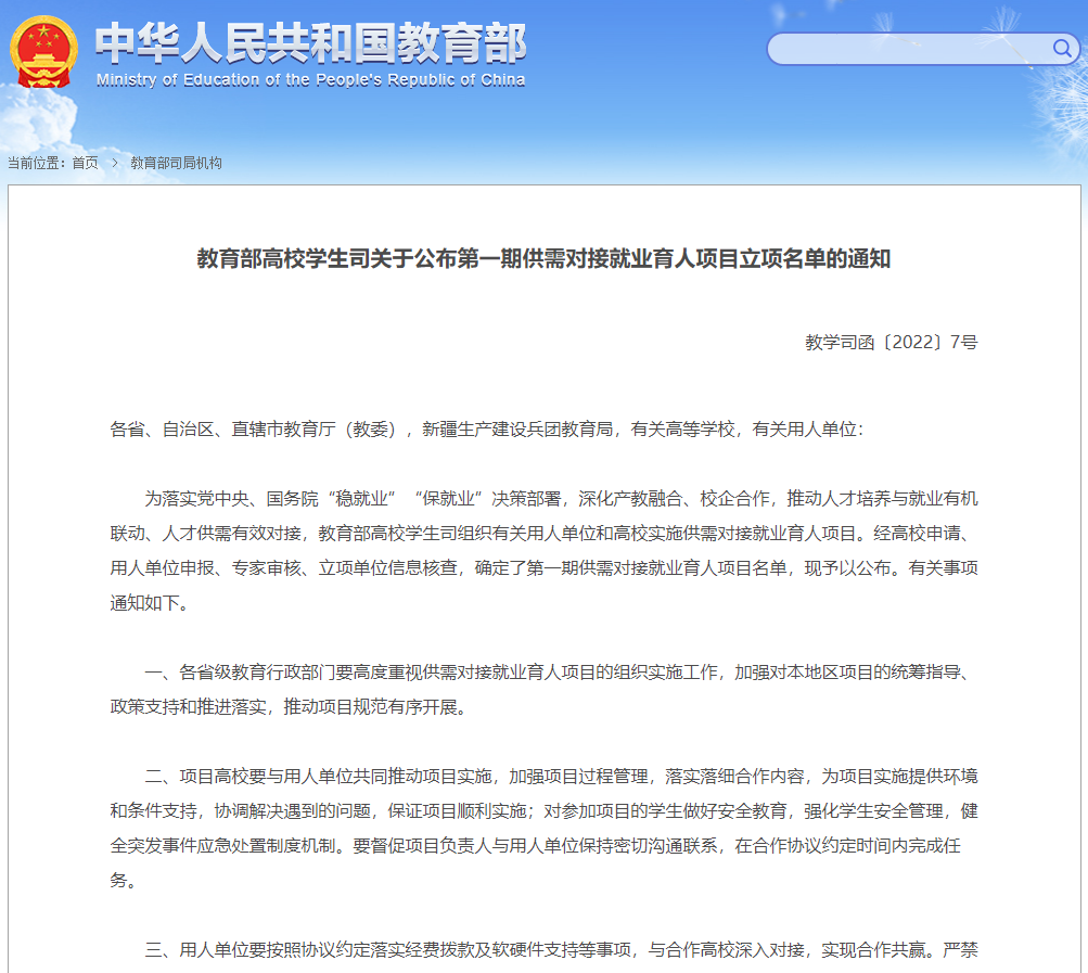 近日,教育部发布《教育部高校学生司关于公布第一期供需对接就业育人项目立项名单的通知》(教学司函〔2022〕7号),确定了第一期供需对接就业育人项目名单,并予以公布,beat365分别与北京华航唯实机器人科技股份有限公司和赛云九洲科技股份有限公司对接的两个就业育人项目成功入围。