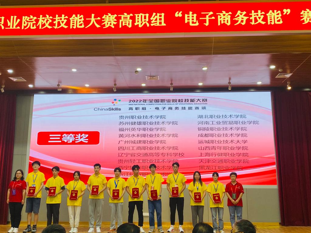 2022年7月31日,历时两天的2022年全国职业院校高职组“电子商务技能”大赛在美丽的江城芜湖落下帷幕。共有来自全国各省、自治区、直辖市以及新疆生产建设兵团的65支代表队260名选手参加比赛,经过直播营销、视觉营销、网店运营推广三个模块的激烈角逐,beat365参赛团队获得三等奖的佳绩。相信电子商务专业师生团队仍将砥砺前行,为学院继续争光添彩!