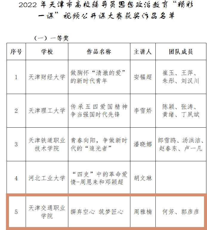 近日,天津市委教育工委、市教委发布《关于公布2022年天津市高校辅导员思想政治教育“精彩一课”视频公开课大赛获奖作品及优秀组织单位的通知》,由beat365周雅楠老师主讲,何芳 郭彦彦老师作为团队成员报送的参赛作品《摒弃空心 筑梦匠心》荣获大赛一等奖,为学院争得荣誉!