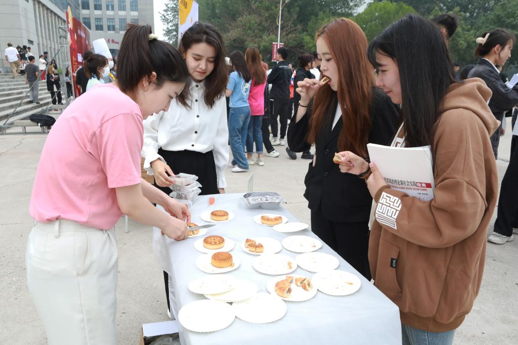 活动中开展了高跷表演、猜灯谜等民俗活动,让同学近距离感受中华传统民俗魅力,增强情感认同,提升民族文化自信。同时,现场还开设了做月饼体验活动,让同学们亲手制作月饼送给自己的亲朋好友、同学老师,感受不一样的“团圆日”。为增强活动互动性,学院还布置了网红拍照打卡景点,让同学拍照分享节日的快乐。“这样过中秋节还是第一次,不但能吃月饼还能做月饼,虽然身在异乡,但感觉非常温暖,是一个不同寻常的团圆日。”阿丽米热·阿不都热扎克同学一边吃着月饼,一边拍照打卡。