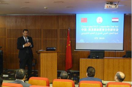 4名埃方专家围绕《关于BTEC职业教育国际标准》《艾因夏姆斯大学鲁班工坊EPIP做中学》《贝尼苏韦夫技术大学办学优势、校企融合及国际合作项目》《技术教育改革策略》进行专题发言。