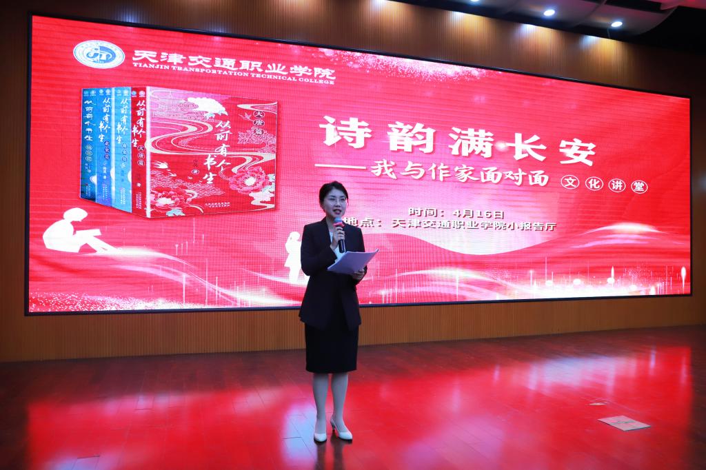 为深入学习贯彻习近平总书记视察天津重要讲话精神,努力践行“四个善作善成”的重要要求,进一步提升校园文化建设,将中华传统文化有机的融入到学院文化建设工作中,不断增强学院师生的文化自信和爱国情怀。4月16日下午,学院统战部与学院图书馆联合百花文艺出版社、津读书苑,共同举办“诗韵满长安—我与作家面对面”文化讲堂。学院赵波副院长、百花文艺出版社杨喆副总经理、百花文艺出版社唐冠群编辑、津读书苑赵鑫店长、著名作家房昊老师出席本次活动。