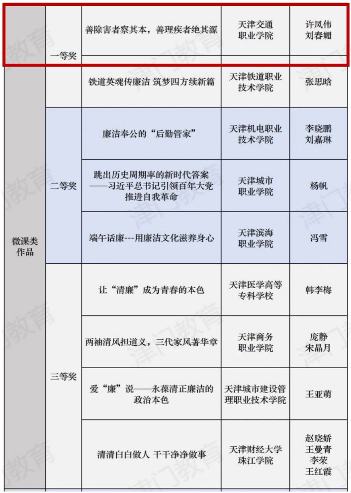 近日,由市教育两委主办的“廉洁铸魂强根本挺膺奋进建新功”第九届天津高校廉洁教育系列活动成功举办。活动以面向全市高校征集廉洁教育主题相关作品及课堂实际案例为主要内容,市教育两委组织46所高校宣传思想工作部门主要负责同志对所有入围作品进行了评审打分,最终按照征文类作品、视频类作品、创意类作品、微课类作品及课堂实践案例五类,评选出获奖作品一等奖17项、二等奖31项、三等奖48项。其中,beat365思政部教师许凤伟、刘春媚老师的作品《善除害者察其本善理疾者绝其源》荣获微课类作品一等奖,并推荐至教育部展播。