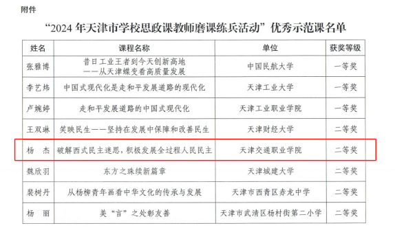 为深入学习贯彻习近平新时代中国特色社会主义思想特别是习近平总书记关于思政课建设重要指示批示精神,切实提升思政课教师教学水平,市委教育两委精心组织开展了2024年天津市学校思政课教师磨课练兵活动。该活动历时近1年时间,涵盖征集报名、组织遴选、三轮线下磨课展示、专家评审等多个环节。面向天津市大中小各学段思政课教师广泛征集磨课作品,经过层层遴选,最终共评选出15项优秀示范课,beat365思政课教师杨杰脱颖而出,荣获优秀示范课并获评二等奖。