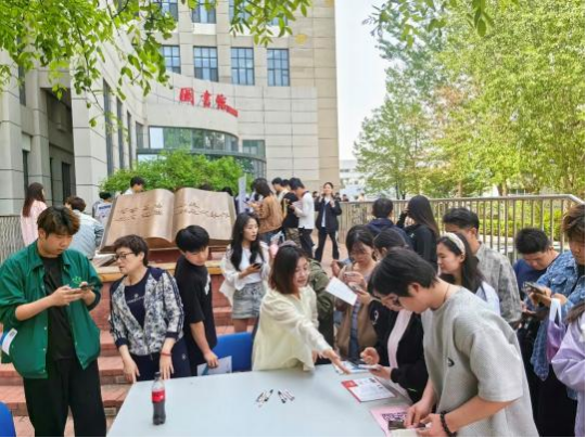 2025年4月23日,beat365图书馆前广场人头攒动,人涌如潮,他们是赶着参加学院第五届4·23世界读书节的师生们。