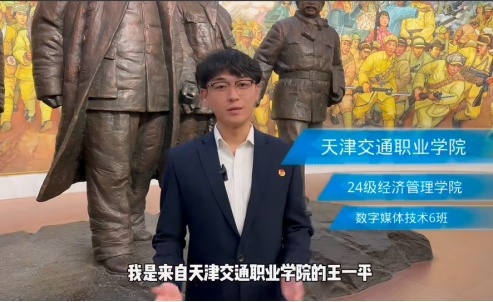 王一平同学的参赛作品《铁血丰碑照津门》以平津战役纪念馆为实景叙事背景,通过深情诵读结合历史场景再现的方式,讲述了津门大地上的革命故事。作品中,他不仅生动诠释了平津战役的峥嵘岁月,更通过馆藏文物背后的红色记忆,传递出新时代青年对革命先辈的敬仰之情和赓续红色血脉的坚定信念。诵读过程中,王一平同学精神饱满、仪态大方,吐字清晰标准,情感真挚饱满,既精准把握了作品的历史基调,又融入了青年一代的时代感悟。