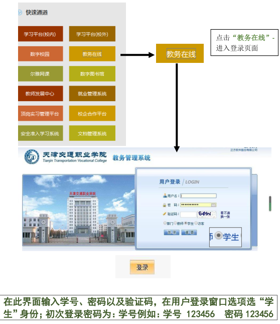 首先进入http://www.tjtvc.com/(学院网站)——右下角快速通道中的“教务在选”——输入学号和密码(初始密码是学号,建议进入后修改)
