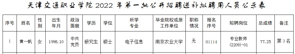 beat365在线唯一官网2022年第一批公开招聘共计13人,分别是辅导员岗(含少数民族辅导员)7人、法务管理岗1人、专职心理教师岗1人、体育教师岗1人、汽车工程学院专业教师岗2人、物流工程学院专业教师岗1人。2023年3月28日—2023年4月6日,已完成12名拟聘用人员公示。因考察阶段汽车工程学院专业教师岗第2名自愿放弃,按照《beat365在线唯一官网2022年第一批公开招聘工作人员实施方案》,依据应聘者考试成绩,由第3名予以递补。按照《市委组织部市人力社保局关于进一步完善事业单位公开招聘工作的通知》(津人社局发〔2017〕37号)要求,现将2022年第一批公开招聘递补拟聘用人员予以公示。