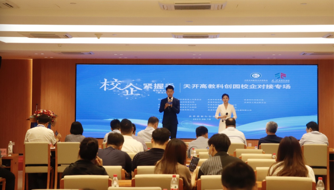 6月18日,在天开高教科创园开园满月之际,市教育两委会同市科技局、市工信局、市知识产权局、市工商联、南开区人民政府,携手南开大学、天津大学等15所高校以及63家高新技术企业走进天开高教科创园,举办“校企紧握手”第五场专题系列活动——天开高教科创园校企对接专场,联合“政产学研金介服”搭建握手通道,为入驻天开园项目提供高质量服务,助力更多优质科研成果在天开园落地转化。